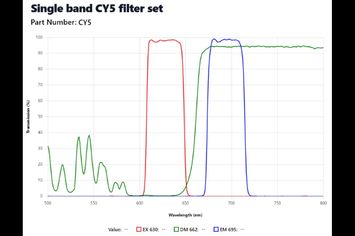 - New filter set - Cy5 (May require an upgraded light source) (EX: 630/50nm, DM: 662nm, EM: 695/50nm) (Dye compatibility: Cy5/AlexaFluor 647/Draq5)